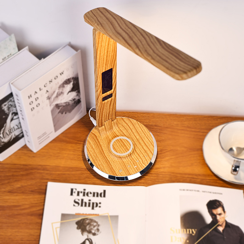 تأثير الشحن اللاسلكي للمصباح المكتبي LED على العمل وجزء المصباح. يمكن أن يكون جزءًا قابلاً للطي من الجسم البلاستيكي. تحتوي القاعدة على منفذي شحن USB بالداخل وشحن لاسلكي.
