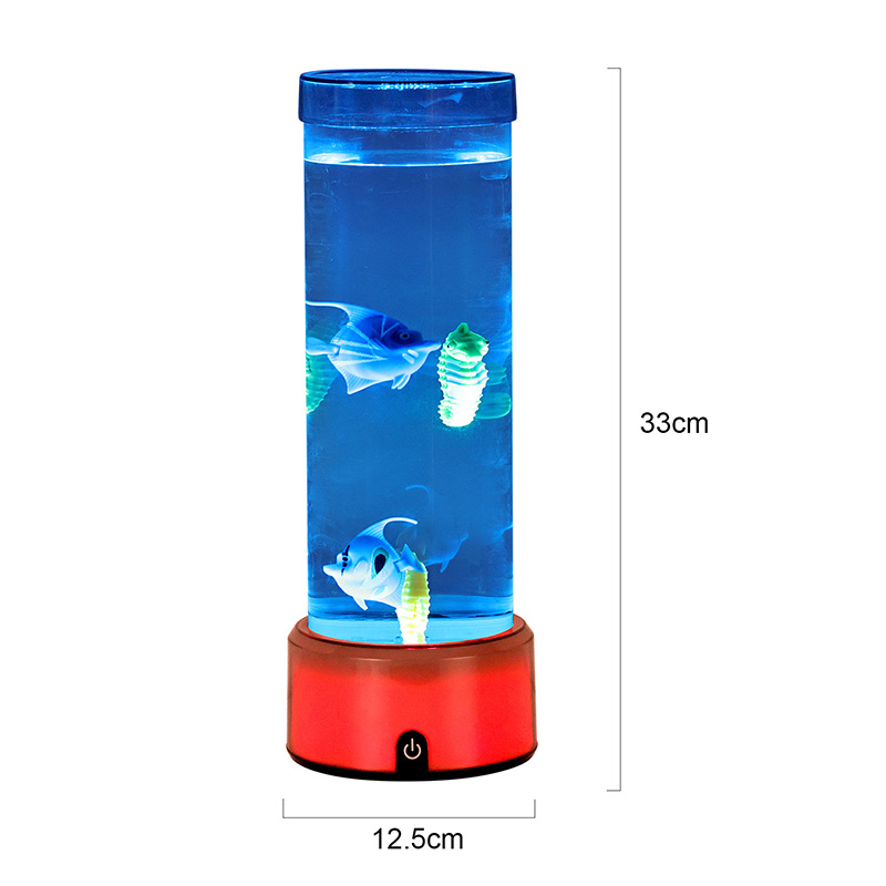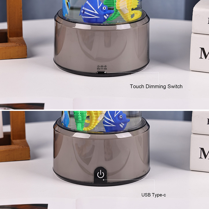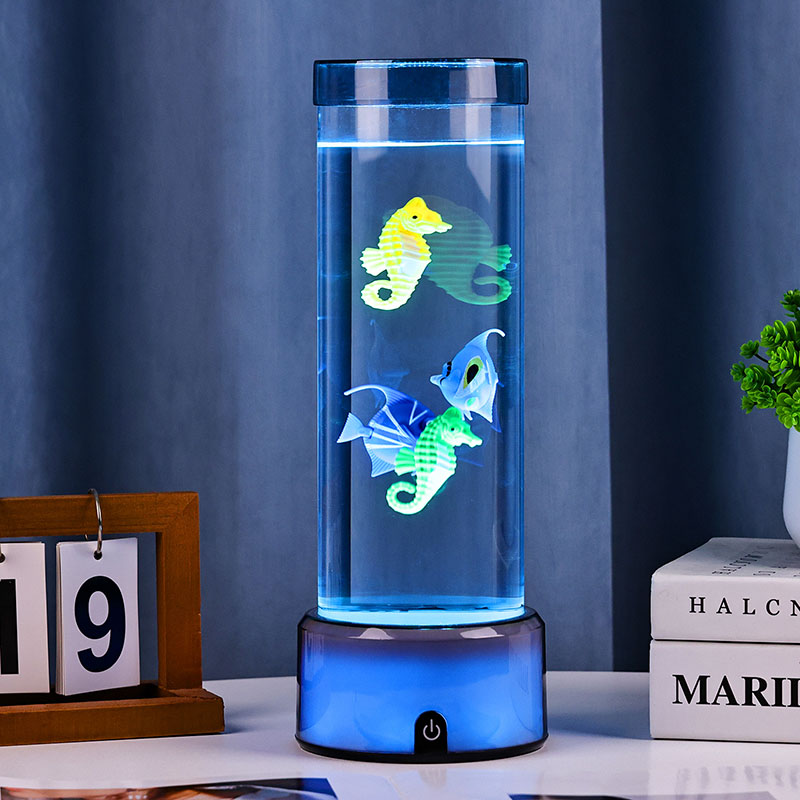 سحر. يتميز هذا المصباح الجذاب المصنوع من البلاستيك المتين عالي الجودة بجسم أسطواني أنيق مملوء بسائل شفاف وأشكال أسماك عائمة مفصلة بشكل جميل - بما في ذلك الأسماك الاستوائية النابضة بالحياة وفرس البحر الساحر - مما يخلق مشهدًا محيطيًا هادئًا ونابضًا بالحياة يجلب الهدوء والبهجة البصرية إلى أي غرفة.