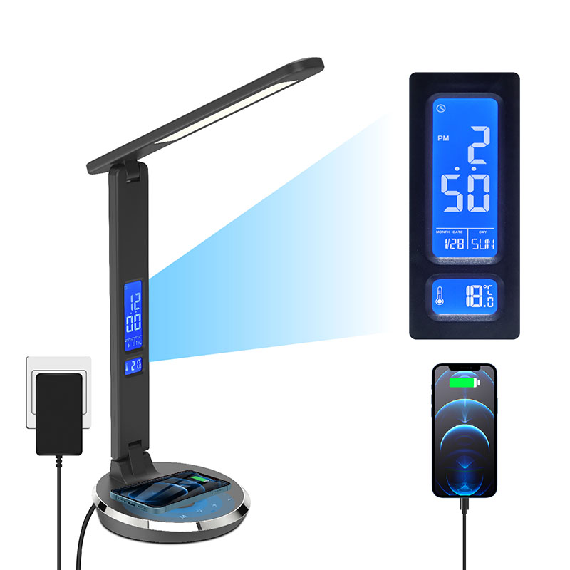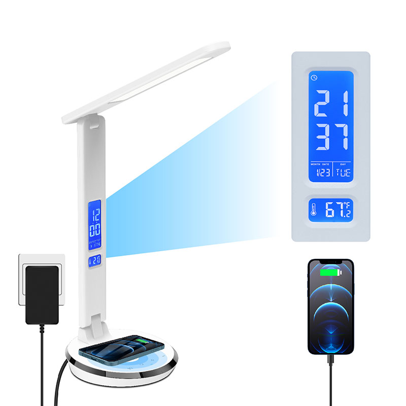 توجد شاشة LCD مع عرض لدرجة الحرارة، والوقت، وساعة منبه، وتقويم دائم مع زر التحكم في الجسم الخلفي. ويوجد منفذ شحن USB خلف ظل المصباح المكتبي.