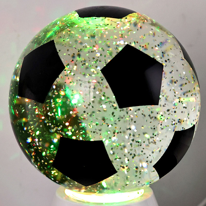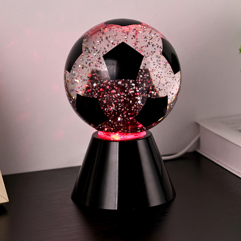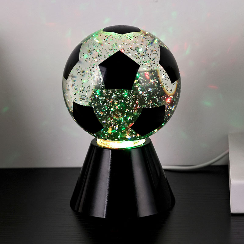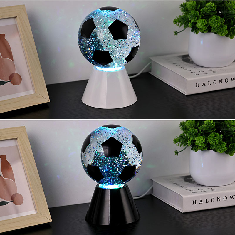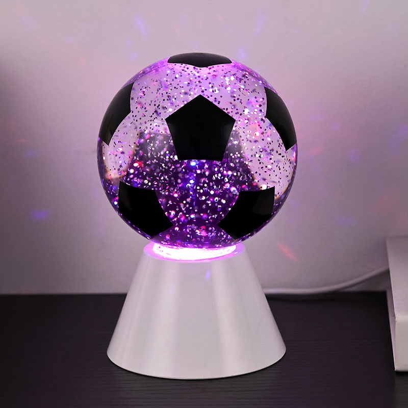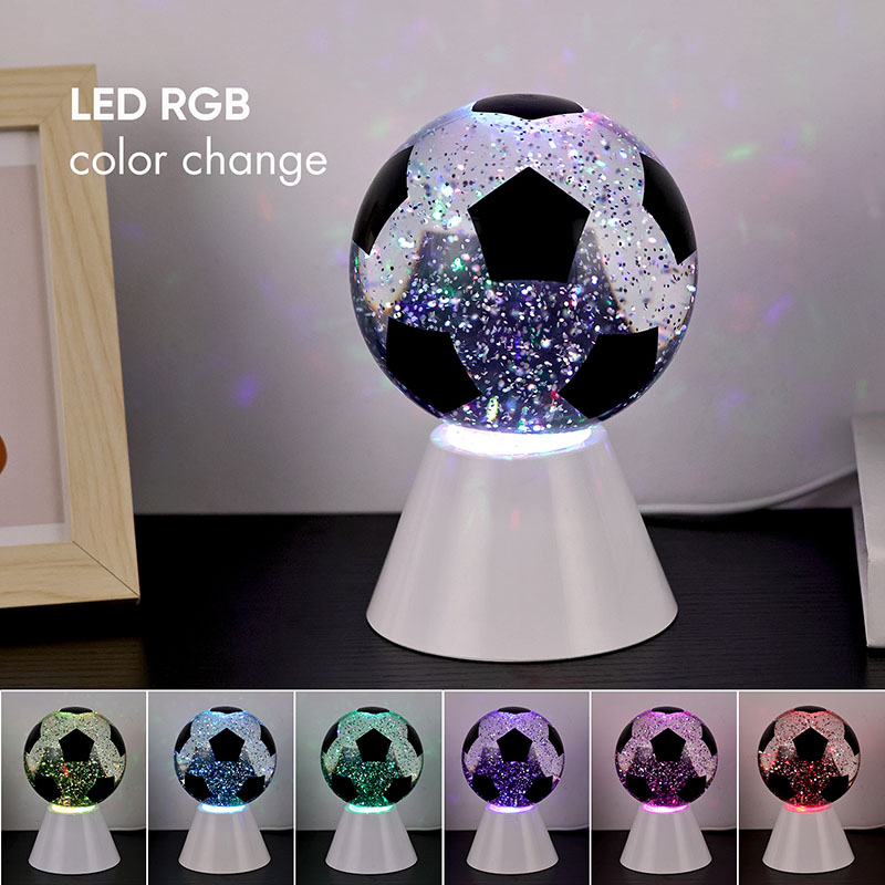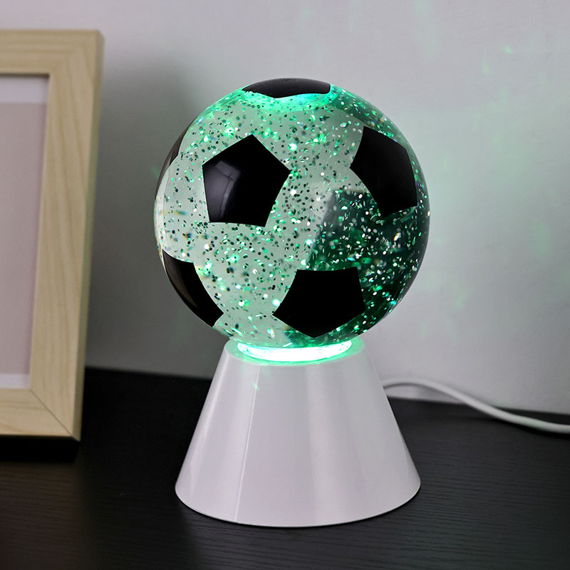 أبيض + تغيير لون LEDيتكون مصباح الهدية الكروي من زجاج علوي وقاعدة بلاستيكية. السطح الزجاجي مطبوع بأنماط كرة القدم، والتي يمكن طباعتها بألوان مختلفة. الميزة الرئيسية لـ Night Light with Football Shade هي وجود سائل داخل الكرة يحتوي على الترتر. بعد تشغيل المفتاح، يبدأ المحرك الصغير المدمج في العمل، وسيتحرك السائل الموجود داخل الزجاج بشكل غير منتظم. في نفس الوقت، يبدأ الضوء السفلي لـ Night Light with Football Shade في التغير، وهو أمر جميل جدًا. يُستخدم الضوء الليلي مع ظل كرة القدم بشكل أساسي في الديكور الداخلي، وفي الغرف، وغرف المعيشة، وغرف الفنادق، وغيرها من الأماكن، ويأتي المنتج أيضًا مزودًا بشحن USB ويمكنه استخدام بطاريات 3AAA.