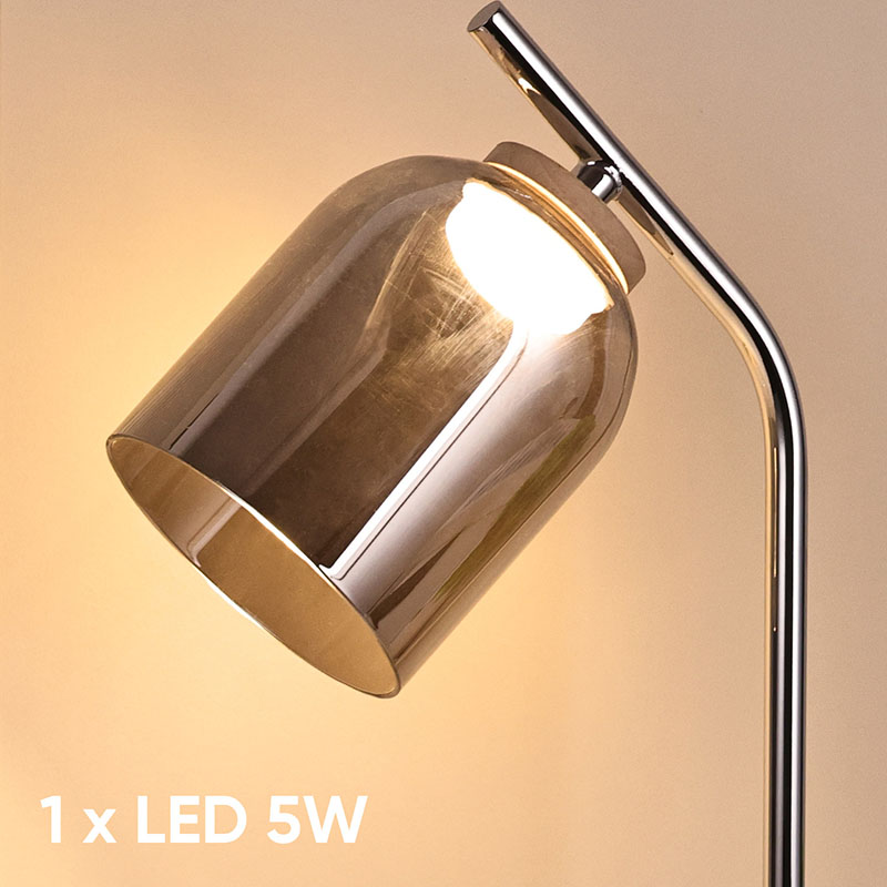 قاعدة من الكروم، غطاء زجاجي دخاني (عنبر).تصميم مبتكر، مادة زجاجية، مظهر راقي وأنيق، نمط تصميم مصباح مكتبي مزخرف للغاية