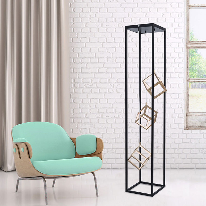 مصابيح أرضية حديثة التصميم ، أكبر ميزة للمنتج هي شكل الإطار المستطيل المكون من المعدن ، مع 3 ثريات LED مربعة بالداخل. يمكن استخدام التصميم العام كديكور في القاعة ، ويوجد زر في الأعلى للتحكم في شدة الضوء