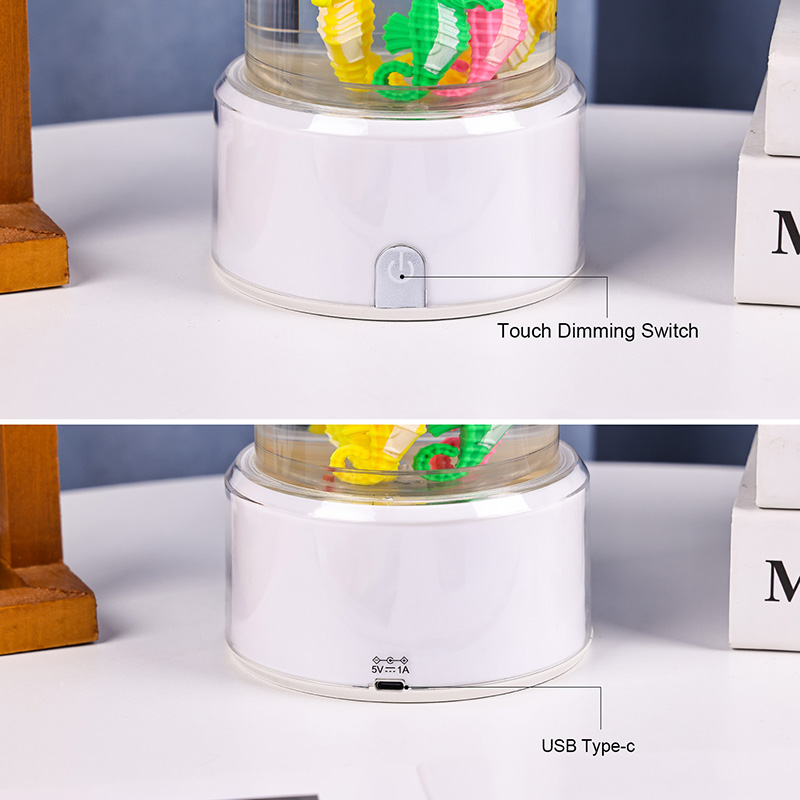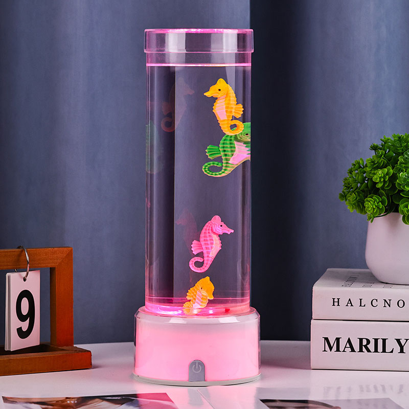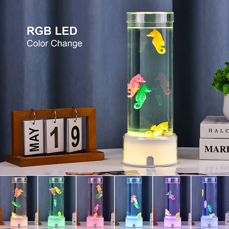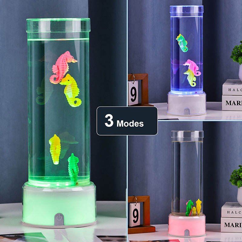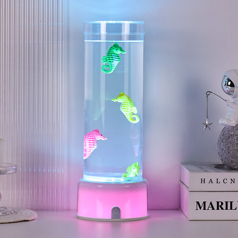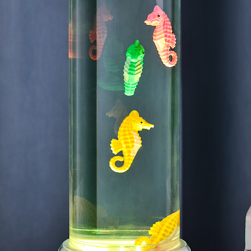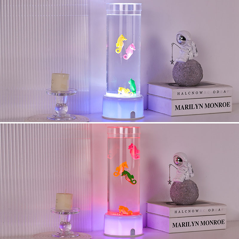 نقدم لكم مصباح ديكور فرس البحر المتغير اللون RGB وهو مزيج آسر من السحر البحري وتكنولوجيا الإضاءة الحديثة المصممة لجلب الهدوء والجمال إلى أي مساحة. يتميز هذا المصباح الأنيق بأشكال فرس البحر النابضة بالحياة والتي تسبح بلطف في غرفة سائلة أسطوانية شفافة مما يخلق
