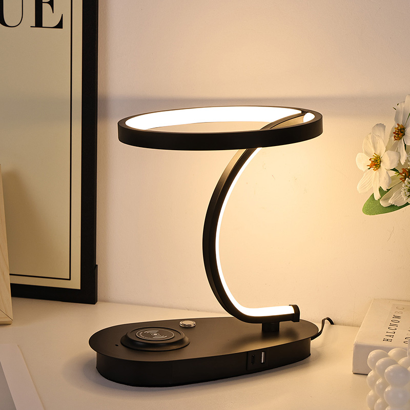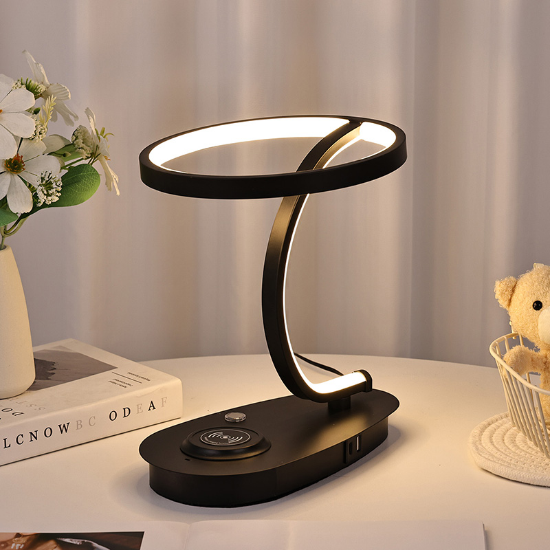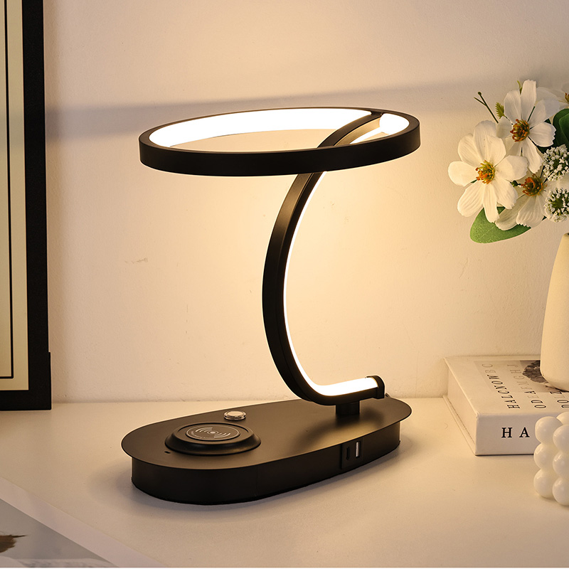 حلقة على قاعدة خشبية لمصباح طاولة، مصباح مكتب LED بشاحن لاسلكي مع غطاء حلقي هو ضوء LED دافئ.